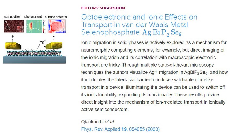 相关工作以“Optoelectronic and Ionic Effects on Transport in van der Waals Metal Selenophosphate AgBiP2Se6”为题发表在Physical Review Applied上,并被选为Editor’s Suggestion进行了亮点报道。亚洲色情亚洲色情 硕士研究生李乾坤为文章的第一作者,方亮教授和游陆教授为论文的共同通讯作者。