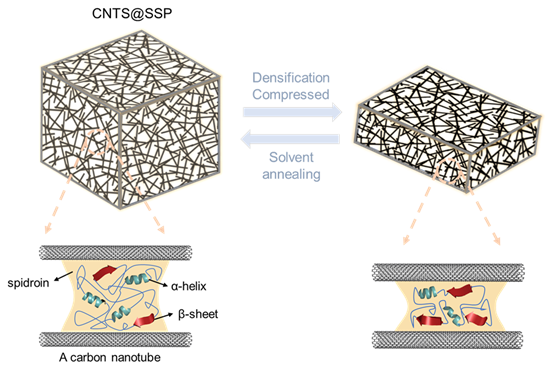 亚洲色情-日本色情网-韩国色情 杨朝晖教授与张晓华教授,及山东大学李逸坦博士合作,制备了一种新型碳纳米管海绵与天然蛛丝蛋白相结合具有多种刺激响应的形状记忆复合材料,通过施加小压力 (仅3个兆帕),可以使分布于碳管海绵纳米孔道中的蛛丝蛋白在室温下发生构象转变,由α-螺旋结构转变为强度更高的β-折叠结构,“冻结”原始碳管海绵的弹性,固定了碳管海绵压缩后的形状;随后在室温下,利用六氟异丙醇溶剂蒸汽退火又可以使蛛丝蛋白的β-折叠结构再次恢复到原始的α-螺旋结构,进而在内张力的帮助下使被“冻结”的碳管海绵的形状快速恢复至初始状态,实现了CNTS@SSP复合材料的可逆形状记忆效应,未来可用作智能传感器、制动器和检测器等。该发现还为未来精准调控蛛丝蛋白二级结构和相转化行为提供了新思路。相关结果以“Vapor-Responsive Shape-Memory Material Based on Carbon Nanotube Sponge Dominated by Pressure-Induced Conformational Transition of Spidroin” 为题发表在《ACS Applied Polymer Materials.》杂志。